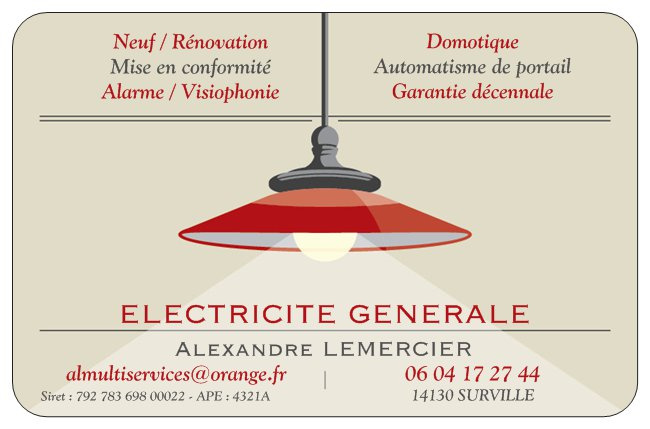 Artisan spécialisé dans l'électricité générale, vous propose ses services dans les secteurs du pays d'auge et de la côte normande. Rénovation, neuf, mise en conformité, alarme, domotique, motorisation portail, dépannage font partis des prestations proposées....