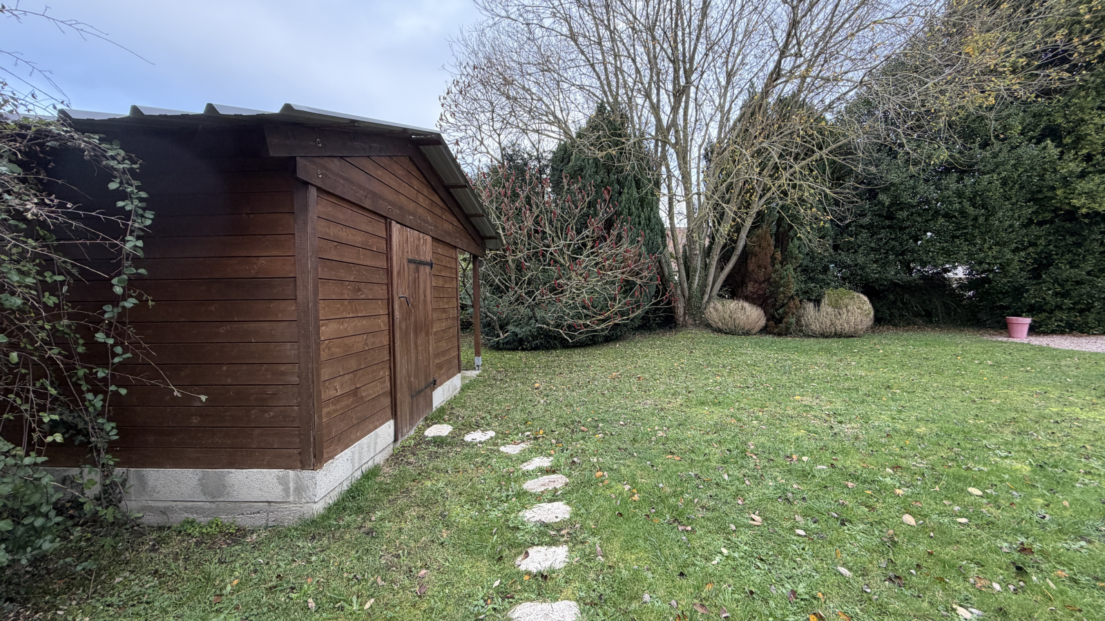 Coté extérieur, un abri de jardin sur un terrain de 400m2 arboré et clos.