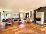 Maison de 155 m² comprenant au rez-de-chaussée, une entrée, une buanderie, un salon-séjour avec poêle à bois, une cuisine aménagée et équipée, une chambre, un WC séparé avec lave-mains, une suite parentale composée d'une chambre, d'un dressing et une salle de bains.